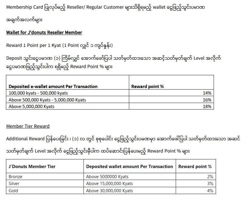(၂) Wallet Top Up လုပ်ဆောင် မည့် customer သည့် Wallet Member (Regular (သို့) Reseller) ဖြစ် နေရပါမည်။ User Level upgrade ပြုလုပ်ခြင်း လုပ်ငန်းစဉ်အား နီးစပ်ရာ J'Donuts ဆိုင်များတွင်လည်ကောင်း J'Donuts Head Office သို့ဆက်သွယ်၍လည်းကောင်း upgrade ပြုလုပ်နိုင်ပါသည်။