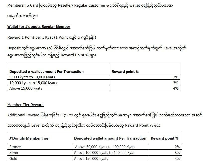 (၃) J'Donuts မှ အခါအားလျော်စွာ J'Donuts member တိုင်း၏ စာရင်းပေးသွင်းထားသော အချက်အလက်များကို အတည်ပြု၍ ခံစားခွင့် program များတွင် ထည့်သွင်း ပေးအပ်သွားပါမည်။